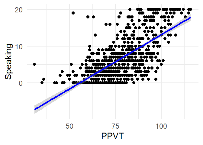The scatterplot in Figure 4.14 visualises the relation between the scores for PPVT and Speaking.